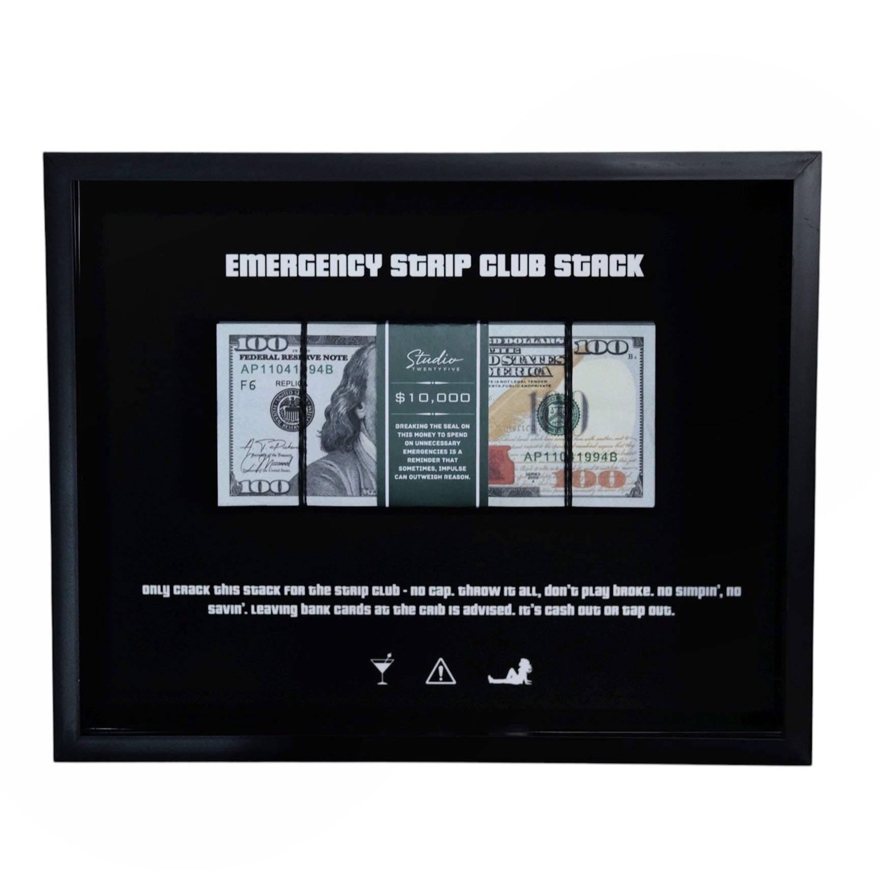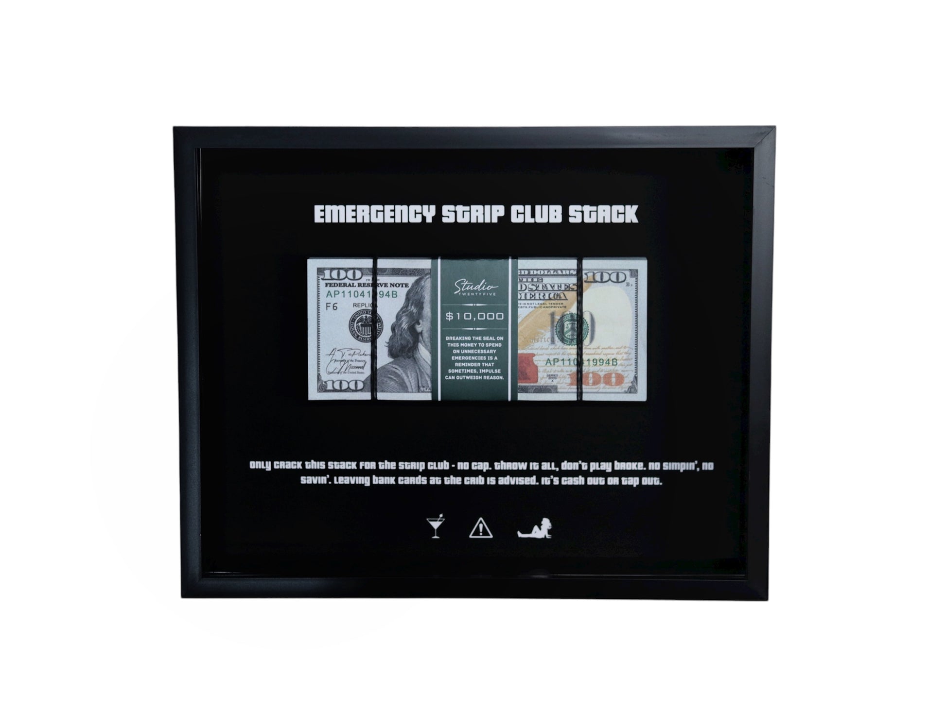 Featuring a realistic cash stack wrapped in a sleek StudioTwentyFive money band, this piece is both motivational and stylish, inspiring you to see what’s possible with a little hustle.