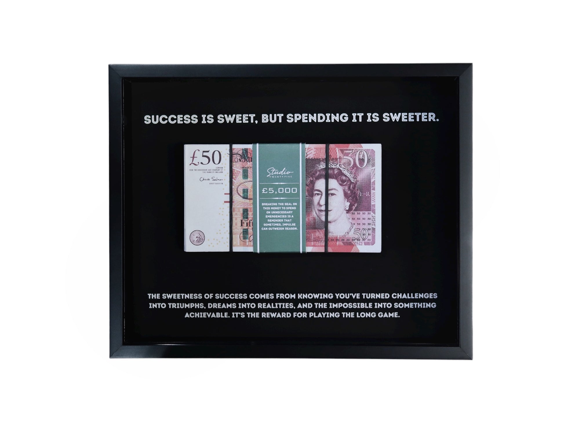 No shortcuts. Just results. Success Is Sweet features a neatly stacked, sharp-edged bundle of fresh-looking £50 notes, preserved in a premium black frame. It’s for the ones who’ve tasted success - and want a reminder to go back for more.